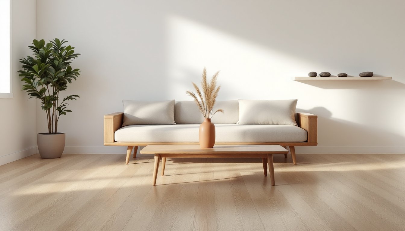 Replace bulky furniture with low-profile alternatives. A platform bed frame with a simple linen duvet in ivory or gray transforms a bedroom. In living rooms, swap overstuffed sofas for a streamlined loveseat or Japanese-style futon on a slatted base. Side tables should be wood or stone, not glass or metal.